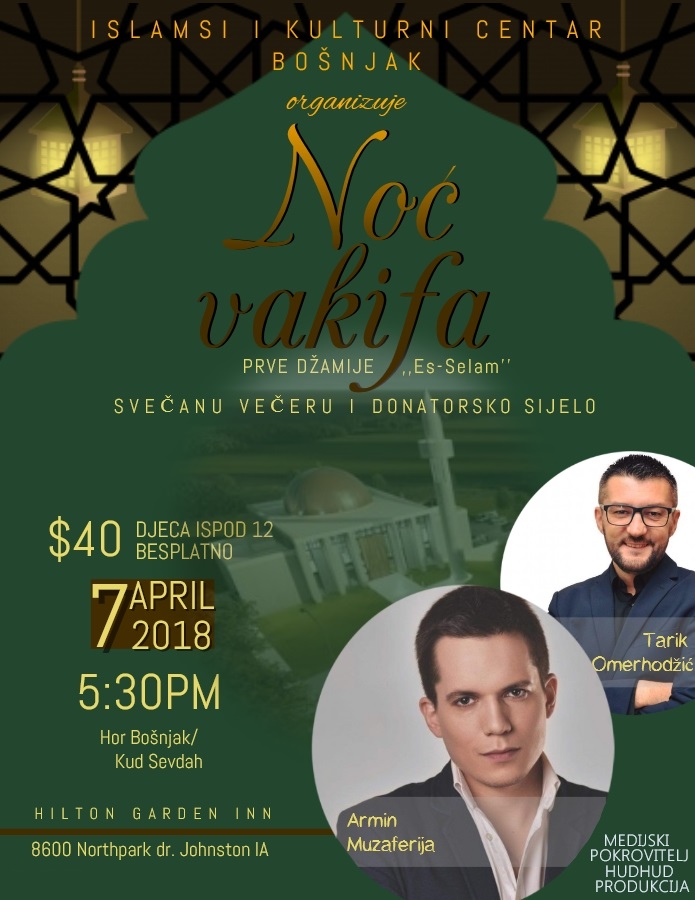 Sve ove aktivnosti su produkt želje i nijeta našeg imana, koji žudi da ugleda svjetlo džamije, ugleda svjetlo kandilja na minaretu i čuje ezan sa džamije Es-Selam, kako bi duša osjetila selamet i smiraj. Ove godine polaznici Škole Kur'ana Časnog, zavšili su hatmu, koju ćemo 06. Aprila 2018 godine, pokloniti svim dosadašnjim Vakifima Prve džamije, a ujedno dokazali da su spremni da preuzmu emanet da će svake godine proučiti Kur'an Časni za Vakife džamije Es-Selam. Aprila 07. 2018. godine biće održan program „Noć vakifa“ sa svečanom večerom i nastavkom donatorske akcije za izgradnju naše džamije. Za sve Vakife na donatorskoj akciji biće uručeni suveniri sa slikom džamije Es-Selam i adresom: 17630 Bosniak Ln Granger, Iowa 50109 Budite i Vi dio porodice Vakifa Prve džamije ,,Es-Selam“.
