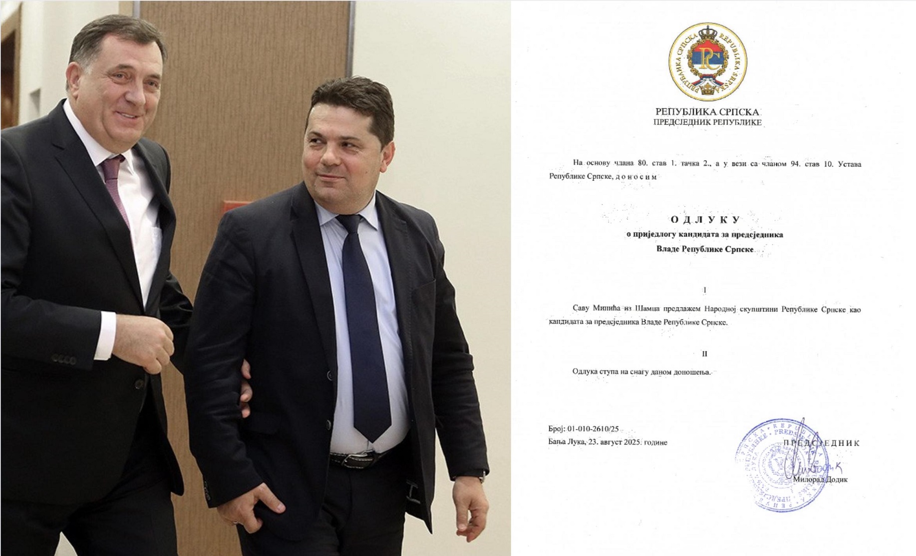 ![]() STEVANDIĆ OBJAVIO DOKUMENT: DODIK PREDLOŽIO MINIĆA ZA MANDATARA - Da bismo spriječili zlonamjerne tvrdnje i manipulacije da je ovlašteni predlagač gospodina Save Minića za mandatara bio neko drugi, a ne Milorad Dodik, taj dokument objavljujemo na internet stranici Narodne skupštine RS, saopštio je predsjednik Narodne skupštine dr Nenad Stevandić. Stevandić podsjeća da se "stvarala nepotrebna i agresivna histerija u vezi sa predlaganjem mandatara i izborom Vlade Republike Srpske", a da je on više puta javno iznosio činjenicu da je predlagač Minića za mandatara bio predsjednik Milorad Dodik, a ne neko drugi ili opunomoćeno lice te da je gospodin Minić legitimno izabran za predsjednika Vlade. „U to su imali priliku da se lično uvjere predsjednici poslaničkih klubova vlasti i opozicije prije početka sjednice Narodne skupštine. Takođe, taj dokument su na uvid tražili mnogi, bošnjački delegati u Domu naroda BiH, kao i pojedini poslanici u Narodnoj skupštini. Da bismo spriječili zlonamjerne tvrdnje i manipulacije da je ovlašteni predlagač neko drugi ili opunomoćeno lice, a ne Milorad Dodik, dokument objavljujemo na sajtu Narodne skupštine“, rekao je Stevandić. Ustavni sud Bosne i Hercegovine od delegata koji osporavaju imenovanje Vlade Rs-a tražio je ranije dokaz da je Savu Minića za mandatara predložio Milorad Dodik koji u tom trenutku više nije bio predsjednik RS-a |