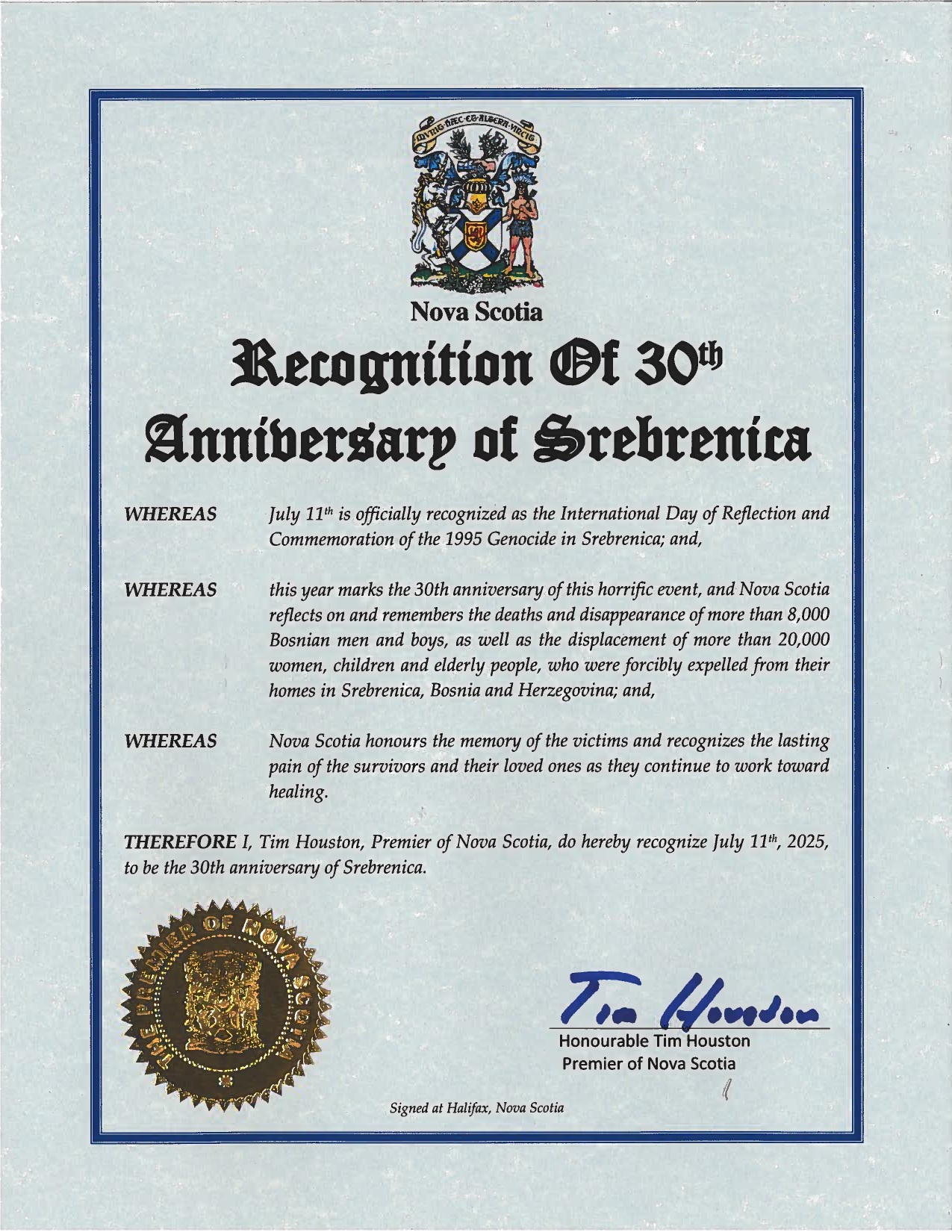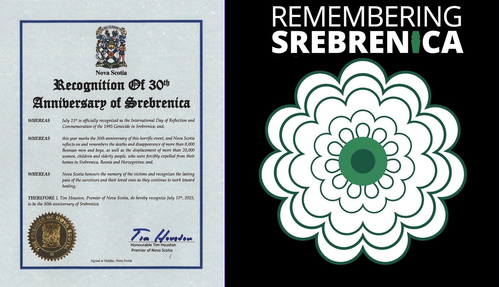 ![]() KANADSKA POKRAJINA NOVA SCOTIA USVOJILA REZOLUCIJU O DANU SJEĆANJA NA GENOCID U SREBRENICI! Kanadska pokrajina Nova Scotia, 8. 10. 2025., usvojila Rezoluciju o Danu sjećanja na genocid u Srebrenici! Inastitut za istraživanje genocida Kanada je povodom 30. godišnjice od genocida u Srebrenici 2025. godinu proglasio godinom misije da se genocid u Srebrenici nikada ne zaboravi, da se žrtve ne prešute, i da istina ne poklekne pred revizionizmom. IGK je upravo dobio proklamaciju od premijera kanadske pokrajine Nova Scotia kojom se 11. juli proglašava Danom sjećanja na žrtve genocida u Srebrenici u ovoj pokrajini. Proklamacija polazi od Rezolucije Generalne skupštine Ujedinjenih nacija kojom se 11. juli zvanično proglašava kao Međunarodni dan refleksije i komemoracije na genocid u Srebrenici. U godini kada se navršava 30 godina od genocida u Srebrenici, Nova Scotia se sjeća više od 8.000 bošnjačkih muškaraca i dječaka, kao i više od 20.000 žena, djece i starijih osoba, koji su nasilno protjerani iz svojih domova u Srebrenici. Nova Scotia odaje počast žrtvama genocida i prepoznaje trajnu bol preživjelih dok nastavljaju raditi na procesu isceljenja.