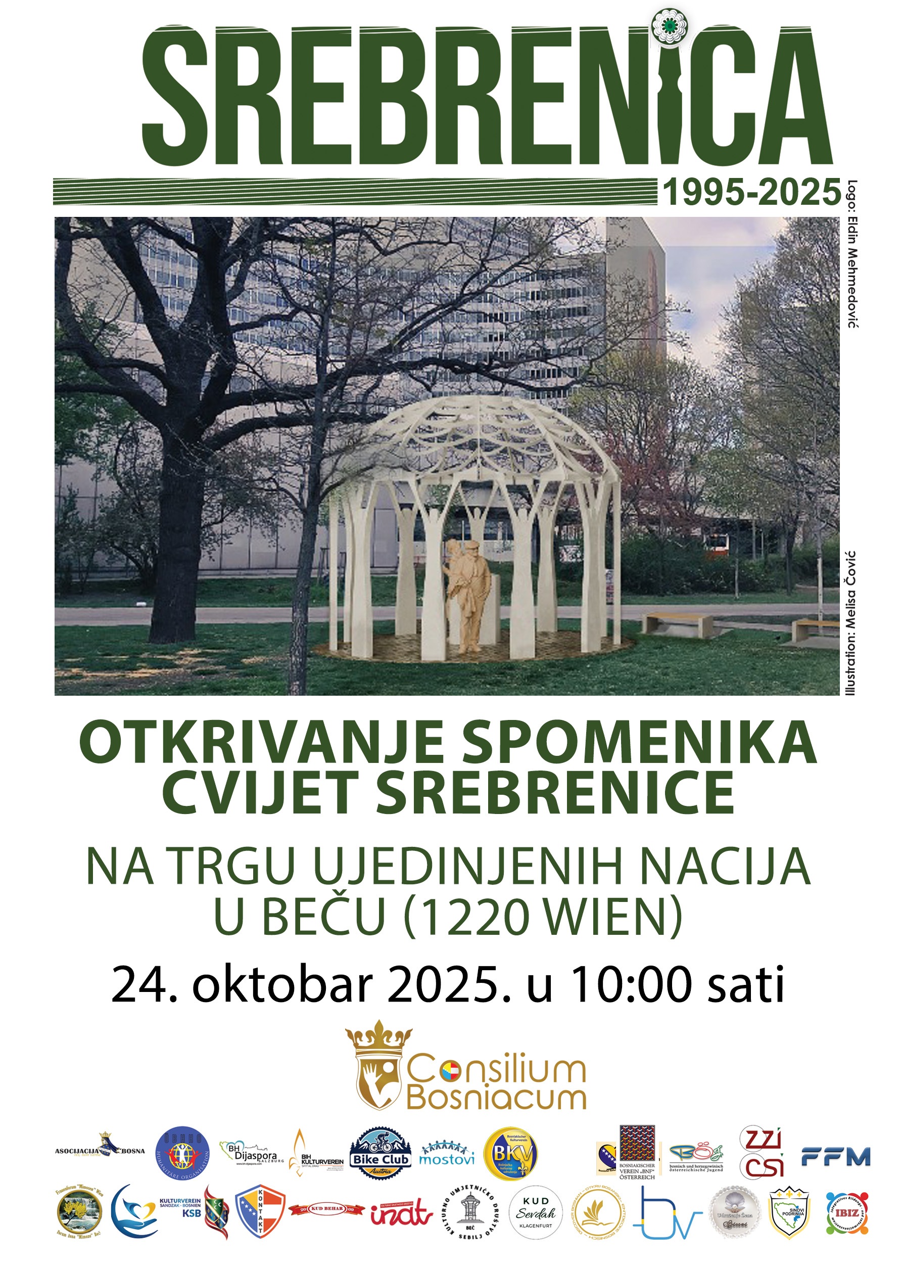 ![]() BEČ POSTAJE ČUVAR SJEĆANJA: OTKRIVANJE SPOMENIKA „CVIJET SREBRENICE“ ISPRED UJEDINJENIH NACIJA Na Dan Ujedinjenih nacija, 24. oktobra 2025. (petak) u 10:00 sati, na Trgu Ujedinjenih nacija u Beču (1220 Wien) biće svečano otkriven spomenik „Cvijet Srebrenice“, simbol sjećanja, istine i opomene čovječanstvu. Projekat realizira Savez bh. udruženja u Austriji „Consilium Bosniacum“ uz podršku institucija iz Bosne i Hercegovine i Austrije. Spomenik, posvećen žrtvama genocida u Srebrenici, trajno će svjedočiti o potrebi da Evropa i svijet čuvaju sjećanje i uče iz prošlosti. Na svečanosti se očekuje prisustvo Majki Srebrenice, visokih zvaničnika BiH i Austrije, te predstavnika međunarodnih organizacija i građana, među kojima Željko Komšić, predsjedavajući Predsjedništva Bosne i Hercegovine Denisa Bećirović, člana Predsjedništva Bosne i Hercegovine Elmedin Konaković, ministra vanjskih poslova Bosne i Hercegovine Sevlid Hurtić, ministra za ljudska prava i izbjeglice Bosne i Hercegovine Beate Meinl-Reisinger, savezna ministrica za evropske i međunarodne poslove Republike Austrije Thomas Reindl, predsjednik Bečkog parlamenta Građani i organizacije, koji žele podržati završne radove, postavljanje i otkrivanje spomenika mogu to učiniti donacijom putem službene kampanje: gofundme.com Plakat se nalazi u prilogu. Dobro došli! |