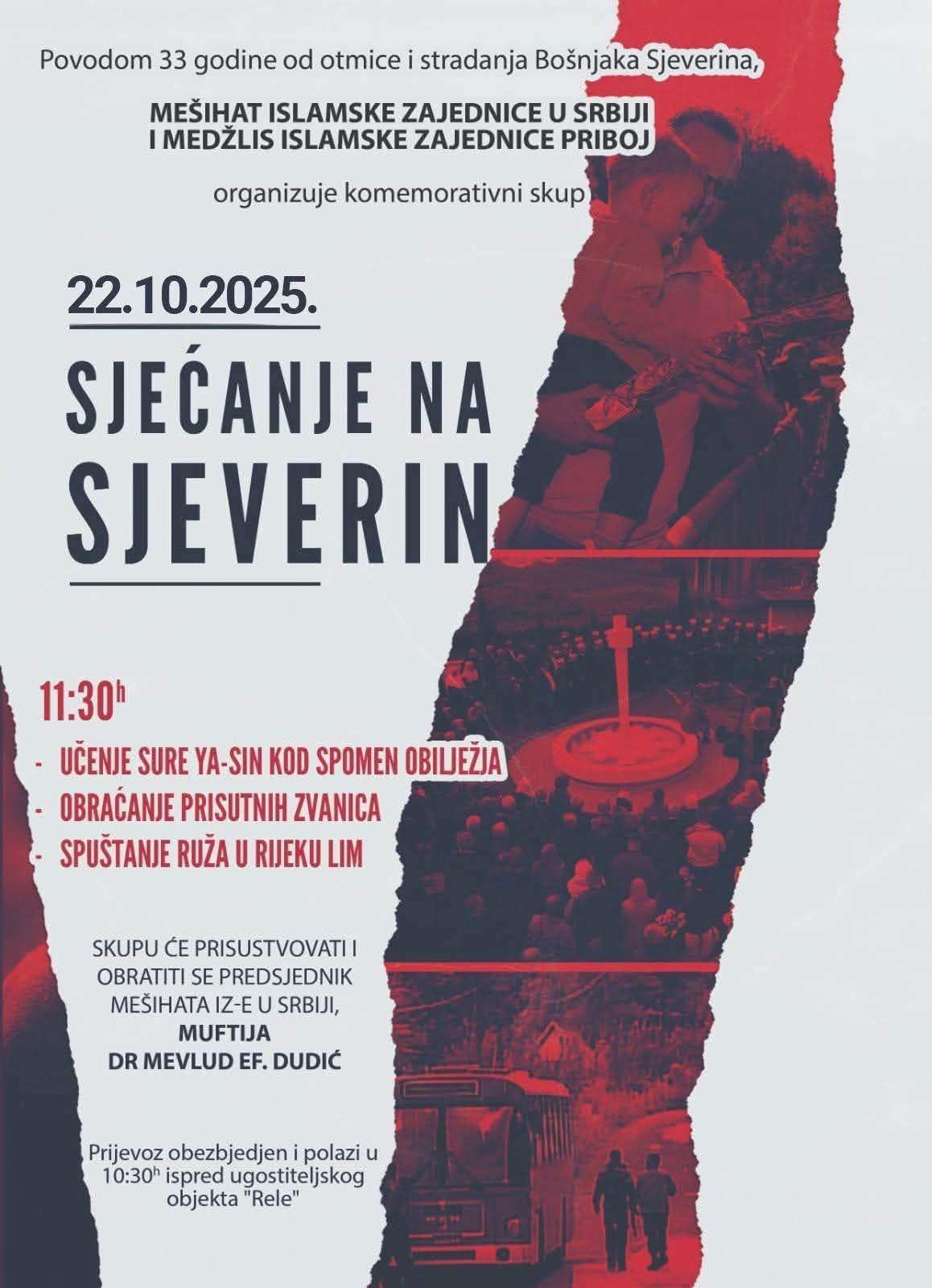 ![]() "SJEĆANJE NA SJEVERIN" – 33 GODINE OD OTMICE I UBISTVA 16 BOŠNJAKA SARAJEVO, 21. OKTOBAR 2025. (MINA) - Povodom 33. godišnjice otmice i ubistva 16 Bošnjaka iz Sjeverina, Mešihat Islamske zajednice u Srbiji i Medžlis Islamske zajednice (MIZ) Priboj organizovat će 22. oktobra komemorativni skup pod nazivom "Sjećanje na Sjeverin". Program počinje u 11.30 sati učenjem sure Ja-sin kod spomen-obilježja u Sjeverinu, nakon čega će se prisutnima obratiti predsjednik Mešihata Islamske zajednice u Srbiji muftija dr. Mevlud-ef. Dudić. Skup će biti završen spuštanjem ruža u rijeku Lim, u znak sjećanja na žrtve. Prijevoz je obezbijeđen, a polazak je planiran u 10.30 sati ispred ugostiteljskog objekta "Rele" u Priboju. Glavni imam MIZ Priboj, Harun-ef. Eminagić, podsjetio je da se na ovaj datum obilježava 33 godine otkako su 1992. godine pripadnici srpskih oružanih snaga i paravojnih jedinica, pod komandom osuđenog ratnog zločinca Milana Lukića, nakon legitimisanja putnika iz autobusa izveli 16 građana Republike Srbije bošnjačke nacionalnosti. – Među otetima je bila i jedna samohrana majka iz sela Sjeverin u opštini Priboj. Bošnjaci koji su tog jutra putovali redovnom autobuskom linijom na posao u Priboj, odvedeni su, mučeni i kasnije ubijeni u Višegradu, na obali Drine, – kazao je Eminagić za Agenciju MINA.