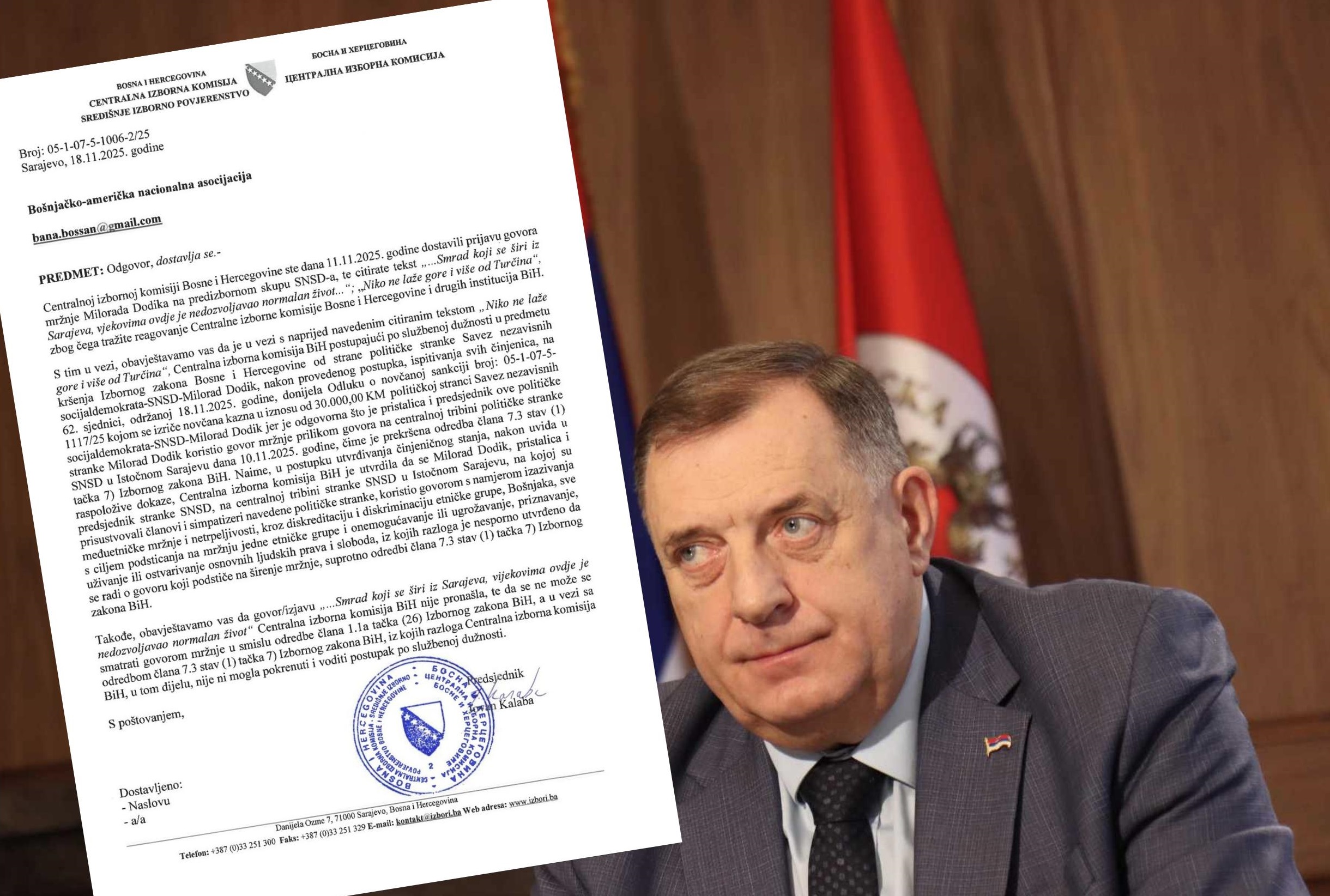 Autor: Bošnjaci.NetObjavljeno: 20. November 2025. 19:11:34 Centralna izborna komisija Bosne i Hercegovine (CIK BiH) uputila je odgovor Bošnjačko-američkoj nacionalnoj asocijaciji (BANA) u kojem obavještava da su prema utvrđenim činjenicama iz pisma, za govor mržnje Milorada Dodika njegovu stranku SNSD kaznili 30,000 KM.