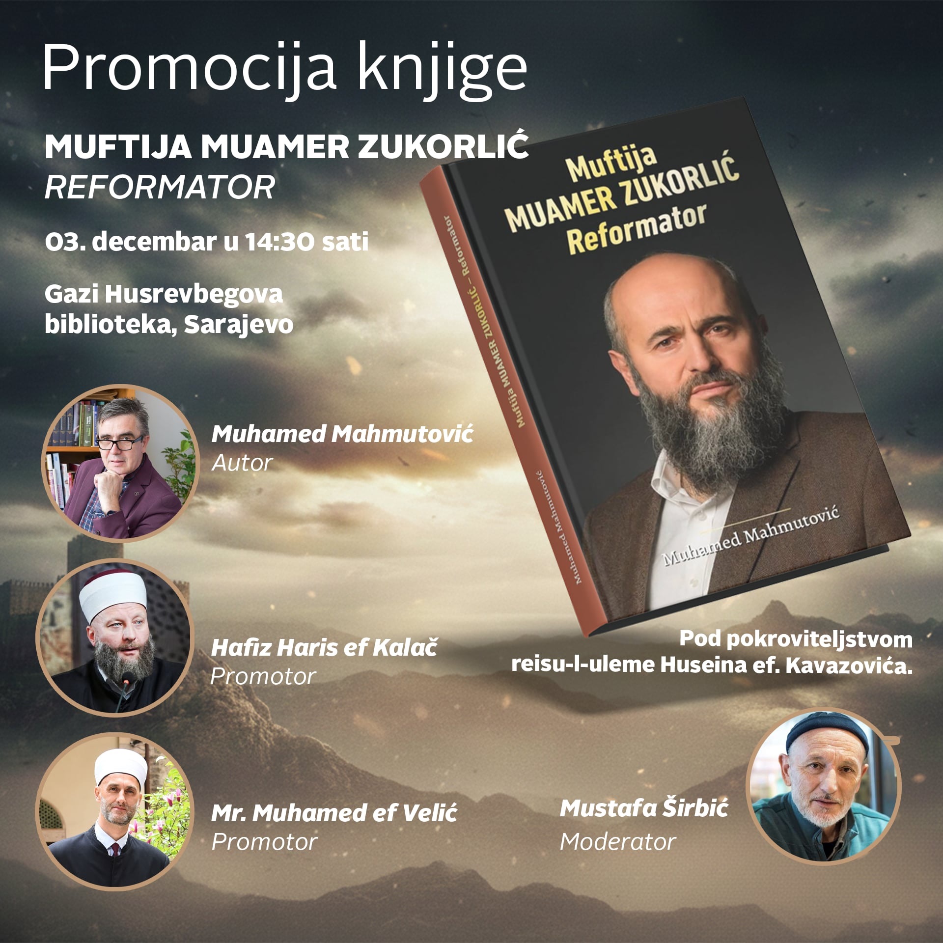 U srijedu, 3. decembra 2025. u Gazi Husrev begovoj biblioteci u Sarajevu, pod pokroviteljstvom reisu-l-uleme dr. Husein ef. Kavazovića, održat će se promocija knjige "Muftija Muamer Zukorlić – Reformator", autora Muhameda Mahmutovića.