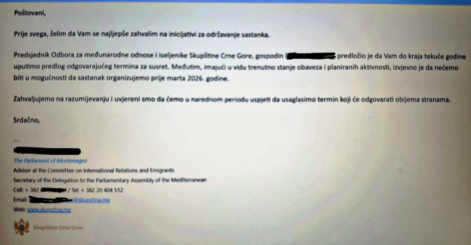 Nakon našeg pisma, 17. decembra 2025. godine dobili smo pozitivan odgovor od Skupštine Crne Gore (u prilogu kao E pošta). Iako je sastanak zakazan za otprilike tri mjeseca kasnije, naša Platforma nastavlja svoje napore kako bi osigurala njegovo održavanje.