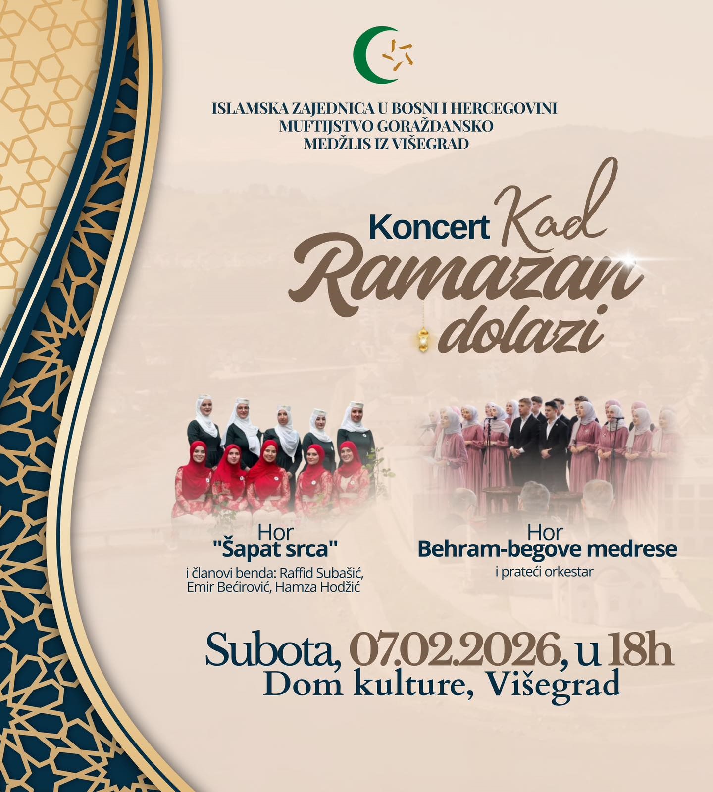 Islamska zajednica u Bosni i Hercegovini - Muftijstvo goraždansko, Medžlis Islamske zajednice Višegrad i Udruženje za promociju kulturnih i tradicionalnih vrijednosti „Šapat srca“ s ponosom pozivaju javnost i predstavnike medija na predramazanski koncert „Kad ramazan dolazi“, koji će se održati u Višegradu, u subotu, 7. februara 2026. godine, s početkom u 18:00 sati, u Domu kulture Višegrad. Na koncertu će nastupiti Hor Šapat srca iz Sarajeva i Hor Behram-begove medrese iz Tuzle, uz prateći orkestar, izvodeći prigodan program ilahija, kasida i sevdalinki, u duhu nadolazećeg mubarek mjeseca ramazana.