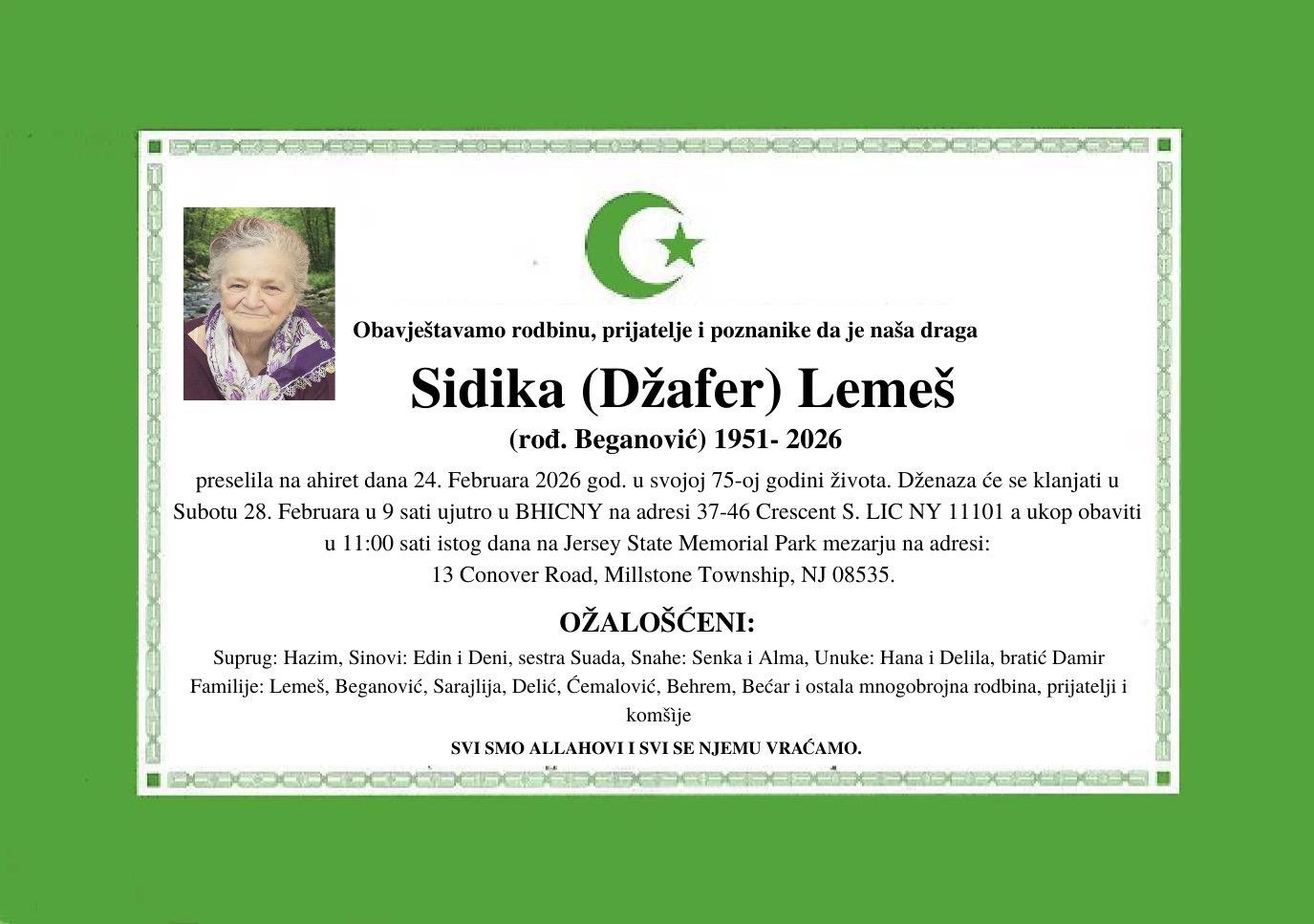 - Tužnim srcem obavještavamo rodbinu, prijatelje, poznanike, komšije i cijelu NY komunu da se svome Gospodaru vratila i na ahiret preselila naša draga “teta Dika” - Sidika Lemeš. Ostaće jedna velika praznina u životima svih onih koji su je poznavali. Bila je veliki borac za pravdu, za Bosnu i Bošnjake a sve je od sebe dala da našu mladost i omladinu u NY, NJ i šire skloni sa ulice i izvede na pravi put kroz folklornu sekciju KUD-a Sedef. Da joj se Allah dž.š. smiluje i uvede u bašče džennetske a porodici podari sabura. Amin.